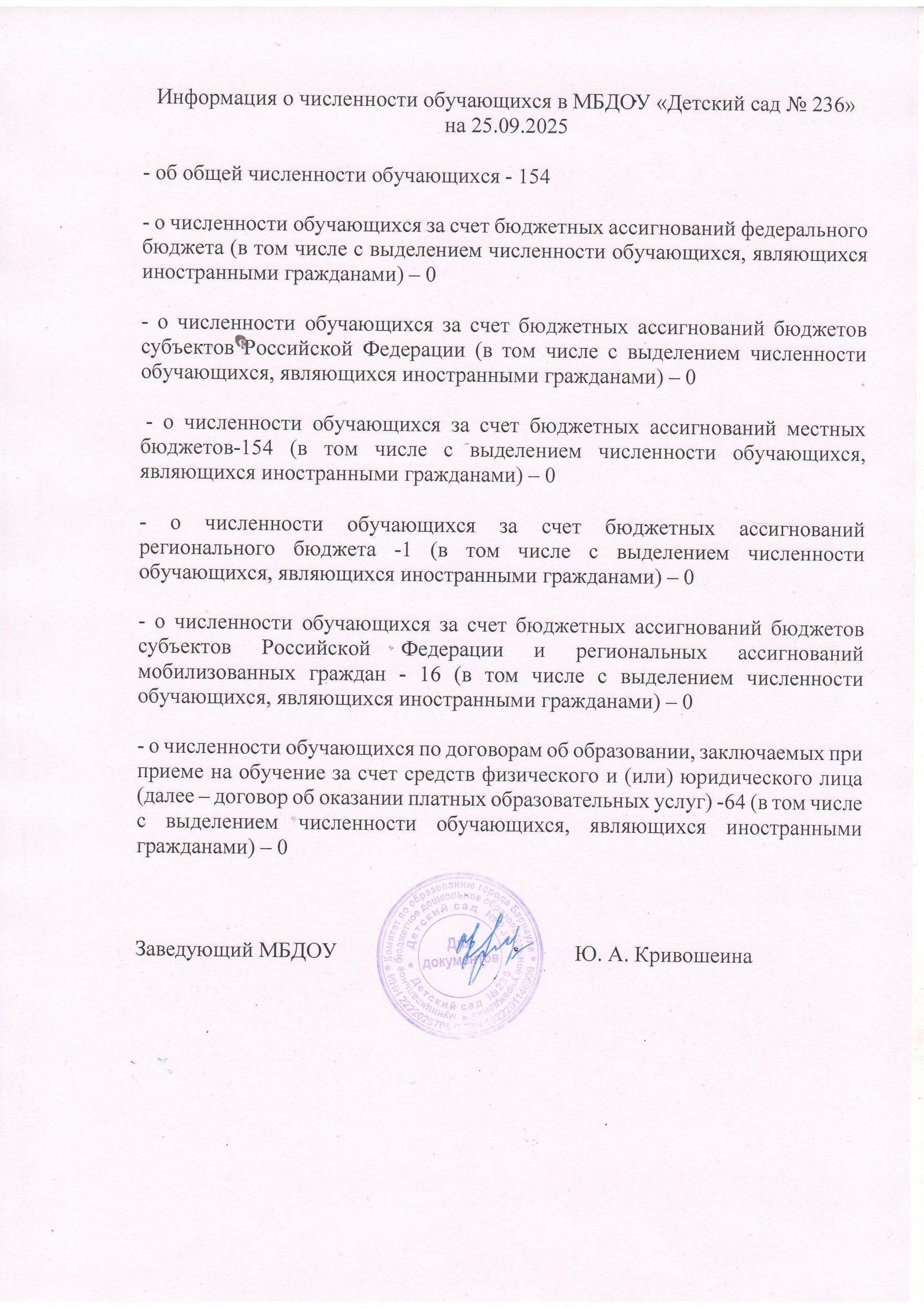 Информация о численности обучающихся в МБДОУ “Детский сад №236”